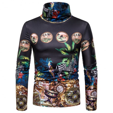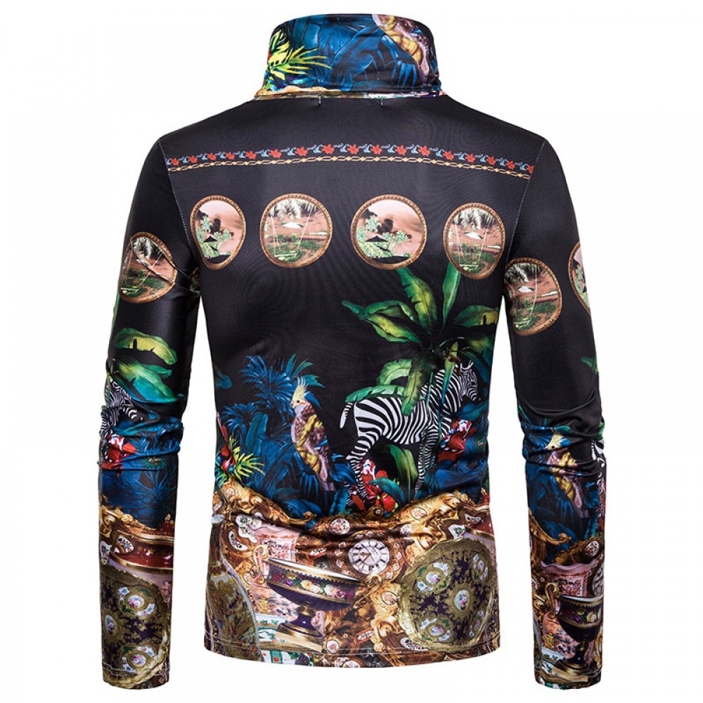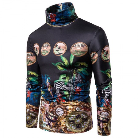 New Men's Large Size 3D Retro Pattern Printing High Neck Long Sleeve T-Shirt Bottoming Shirt